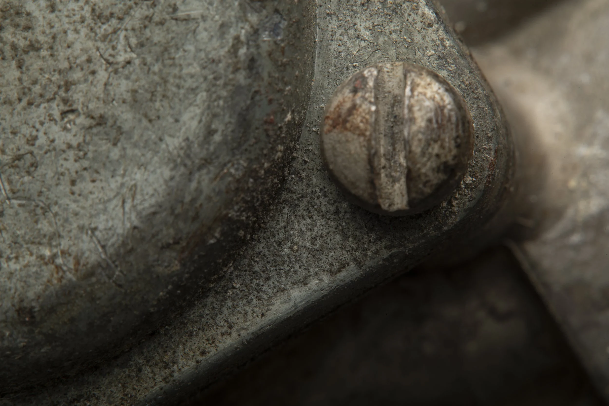 High-magnification macro capture using diffused lighting to reveal fastener slot geometry, surface texture, and oxidation patterns.