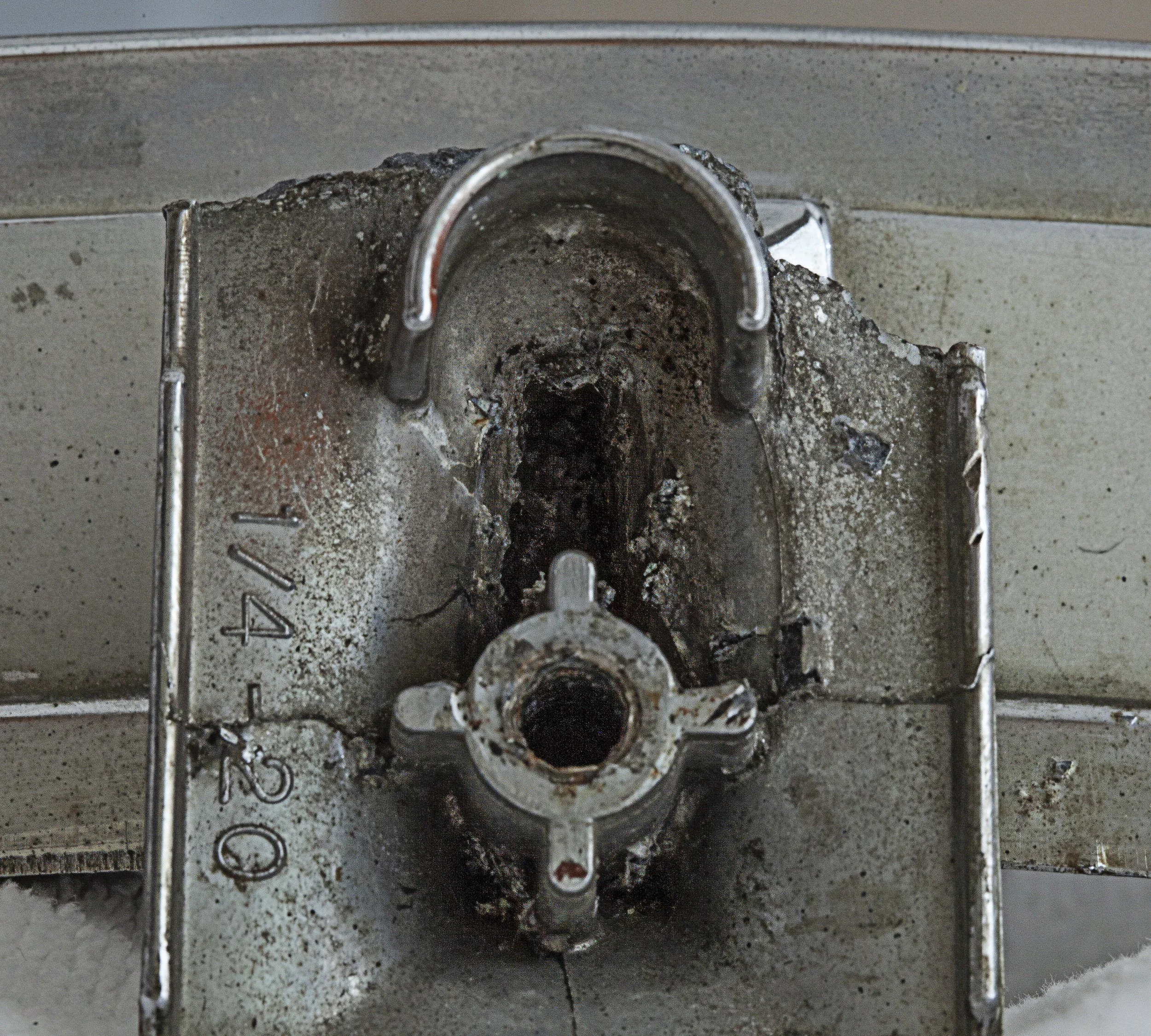 High-magnification macro capture using diffused directional lighting to highlight stamped metal contours, weld geometry, and surface condition.
