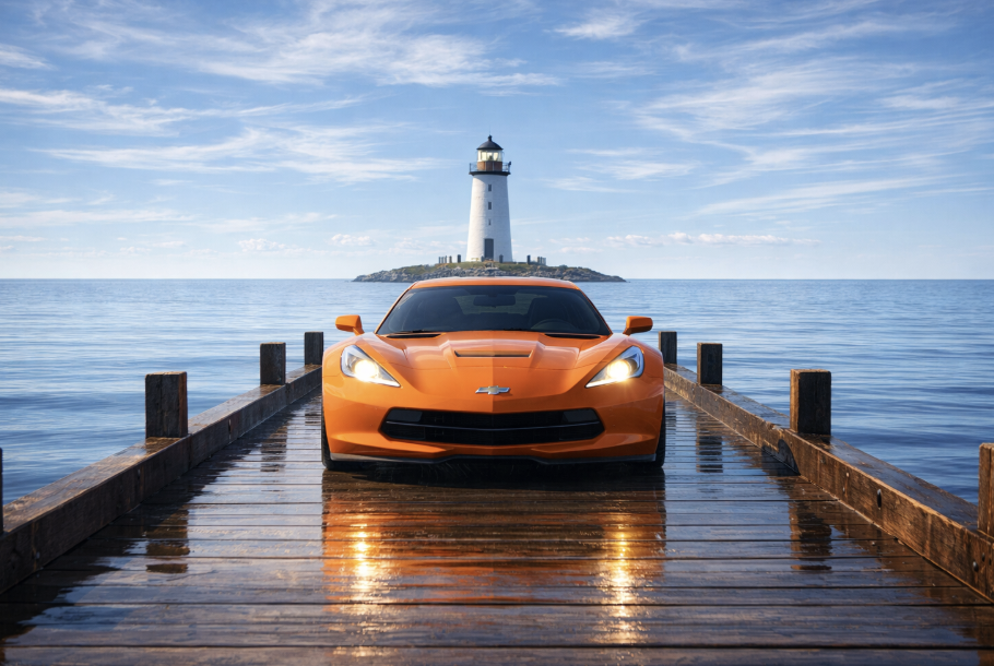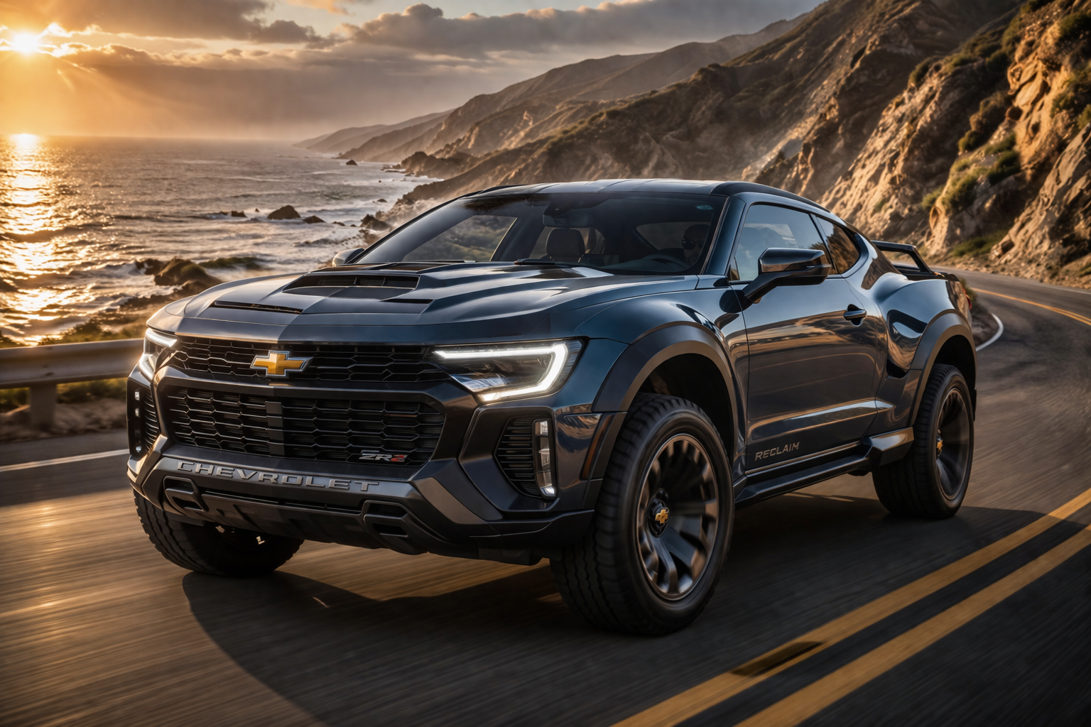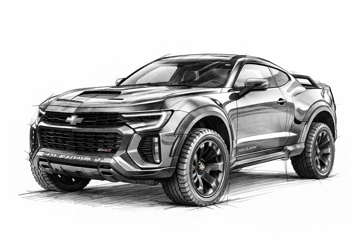 The vehicle must retain its low, wide, slightly elevated performance stance, blending Corvette Stingray sleekness with Silverado strength.