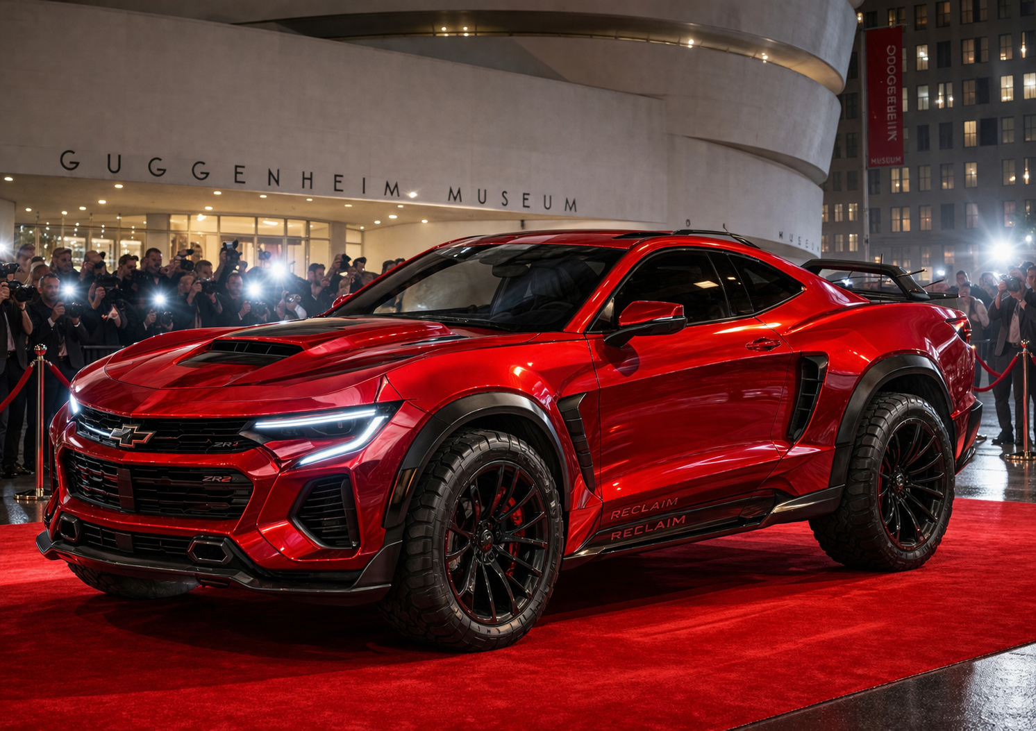Now, using this sketch, create a realistic car in the color red. It should represent this sketch in all of its details and proportions. Put it in a scene in front of the Guggenheim Museum with all the lights on the vehicle on a red carpet with camera flashes going off.
