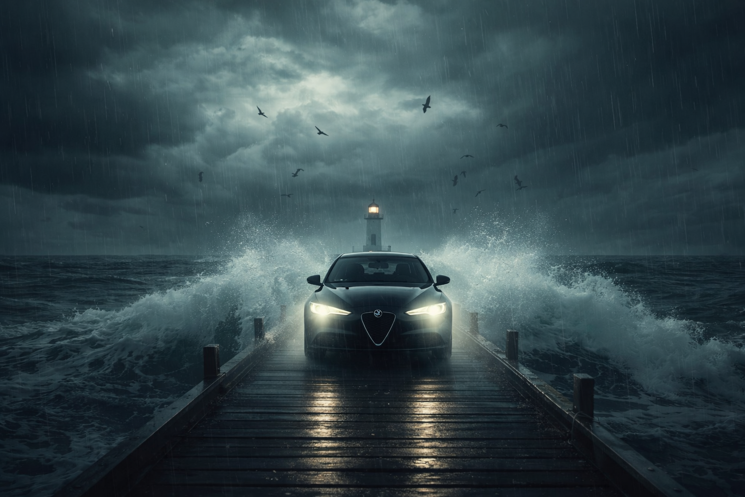 Design an image with an alpha romero driving toward me with all of it's lights on, on a pier with waves crashing over the sides of the pier