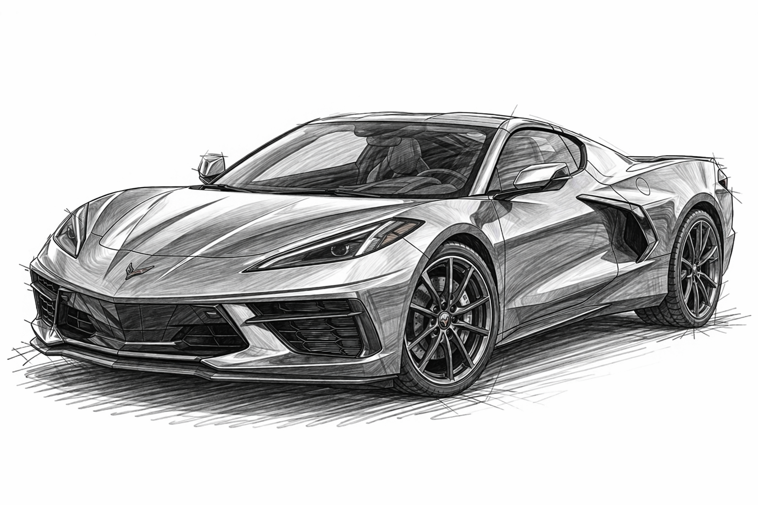 You are an automotive designer. Your task is to design a sleek sports vehicle like the Corvette Stingray that would appeal to the customer who is now purchasing the Chevy Silverado. You have to combine the sleek with the rugged. Your buyer is retired, over 50. I see them as performance curious, light adventure vehicles. I want the vehicle to be a true hybrid and I want the target market to feel their youth regained. Create a sketch on a blank white background of this exact vehicle