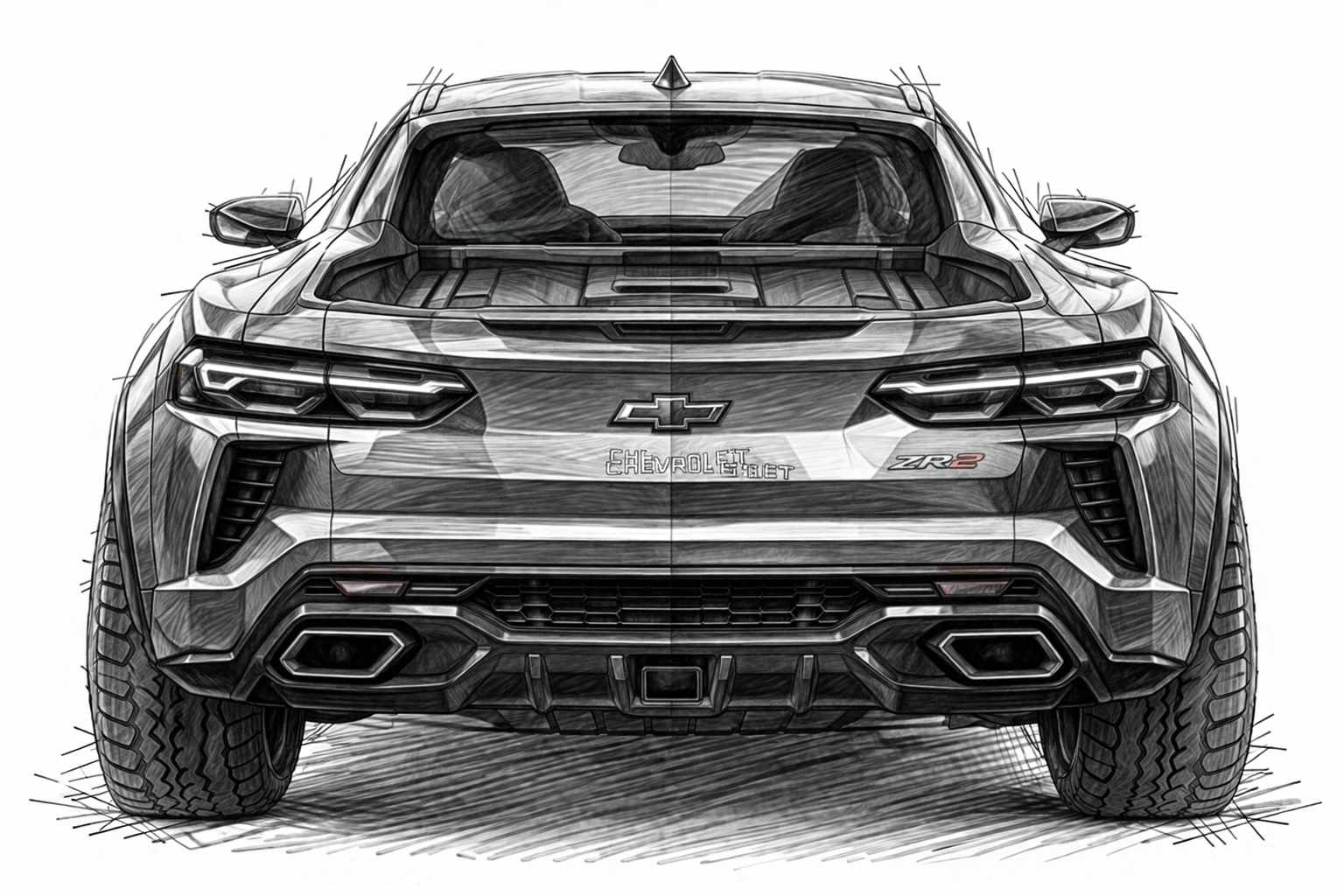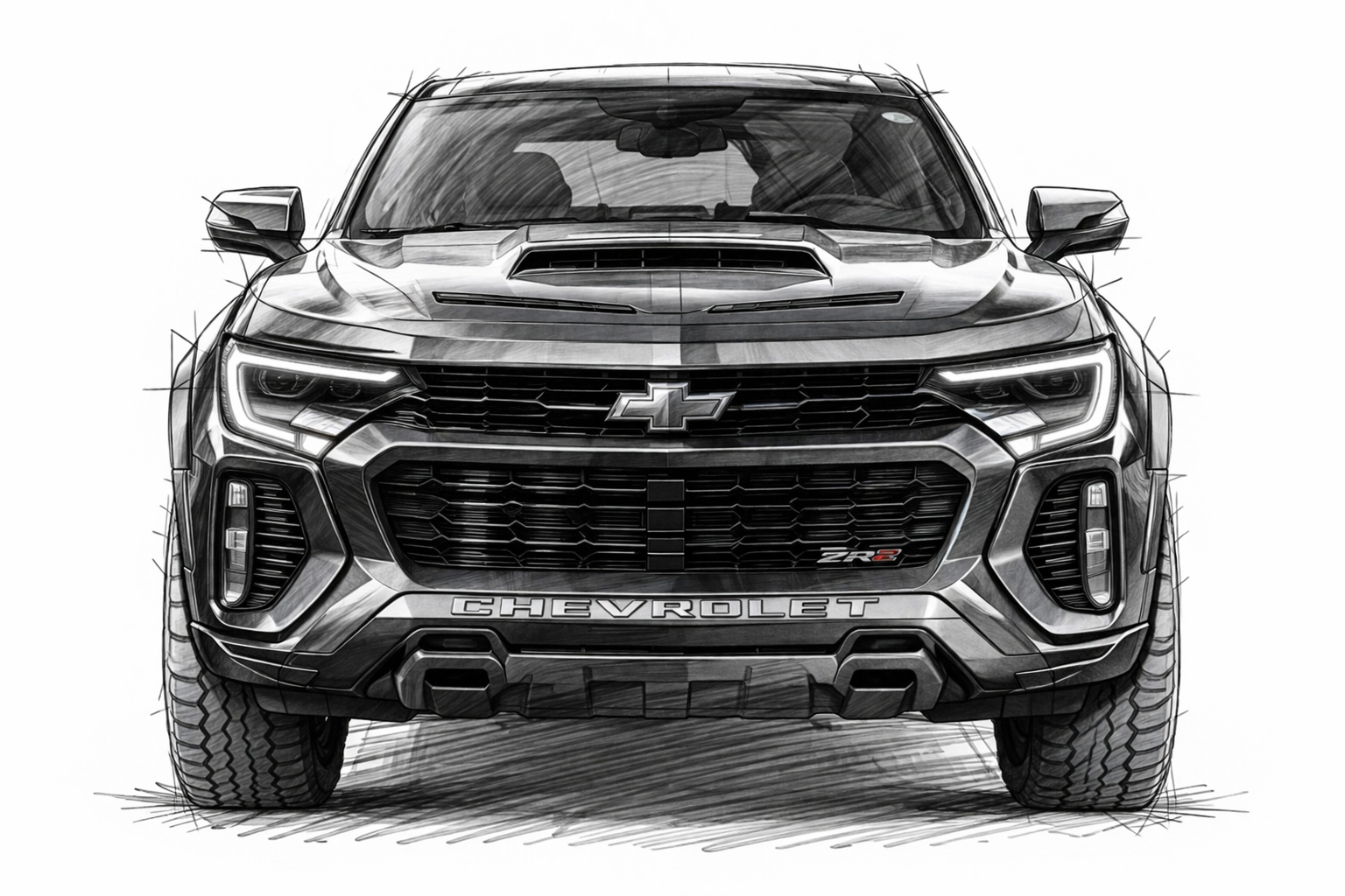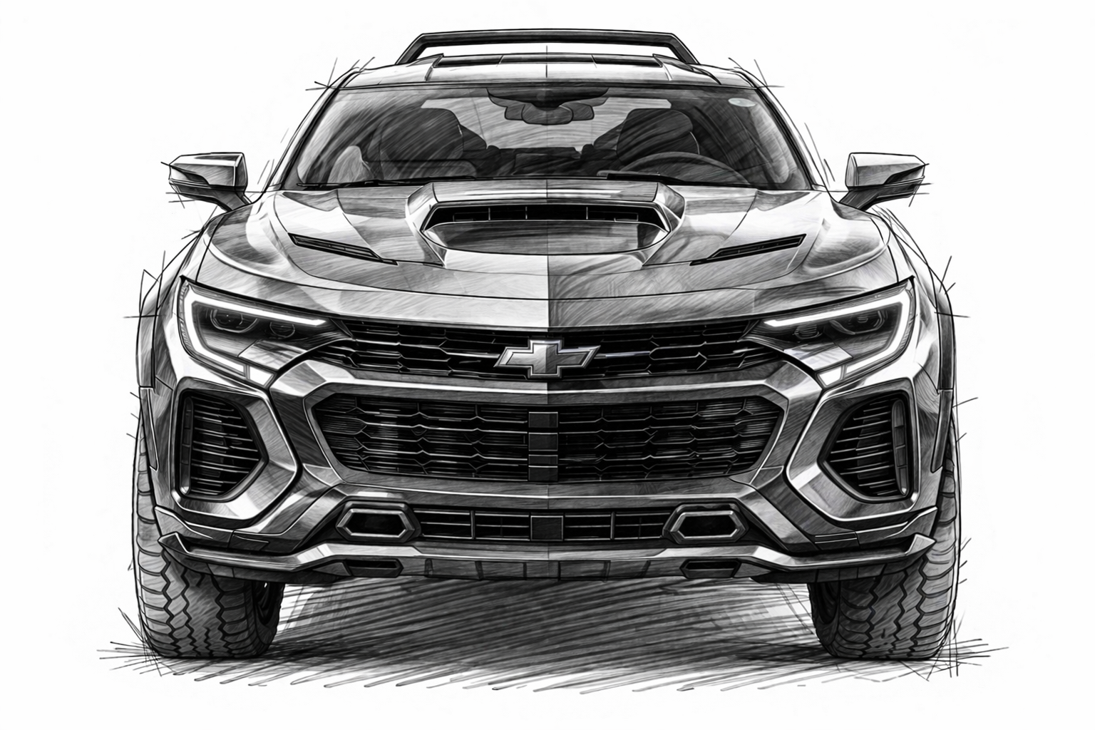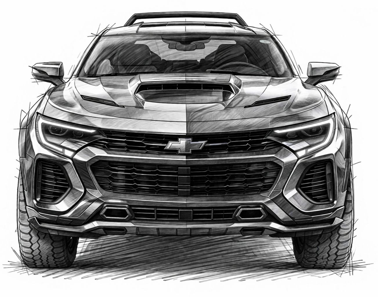 Create a highly detailed pencil sketch on a clean white background of the exact same Chevrolet performance adventure coupe concept shown in the previous 3/4 view, now in a perfectly aligned front view.