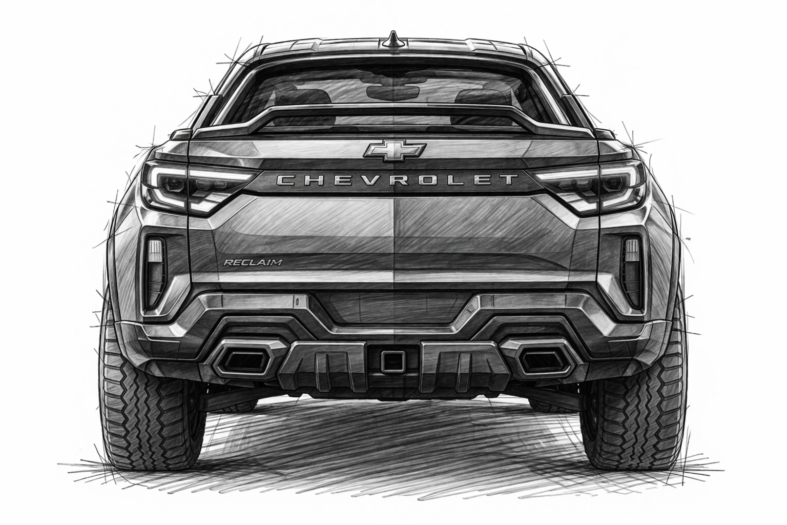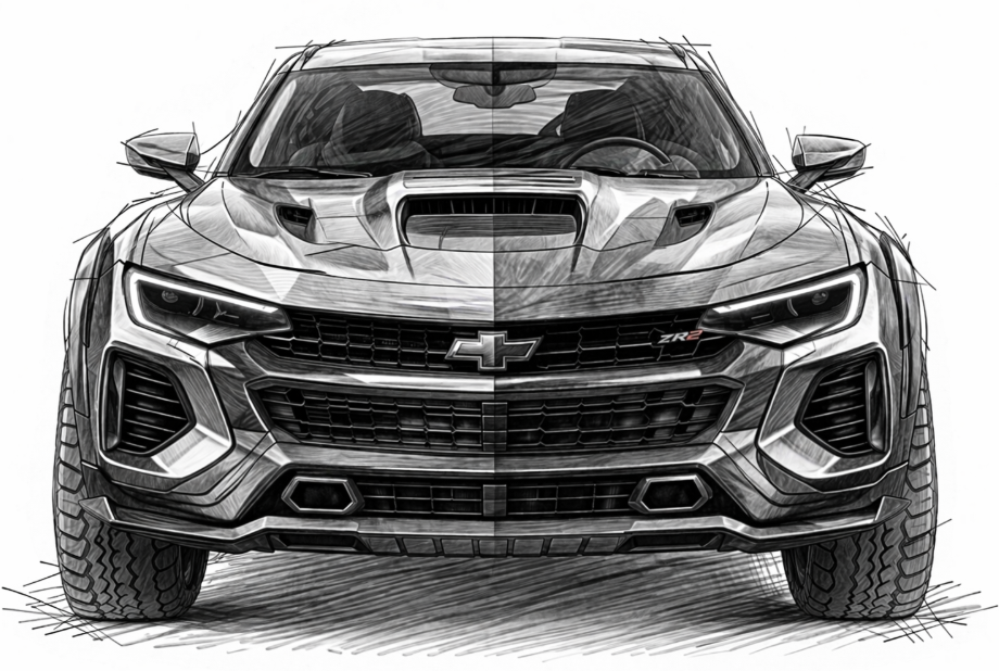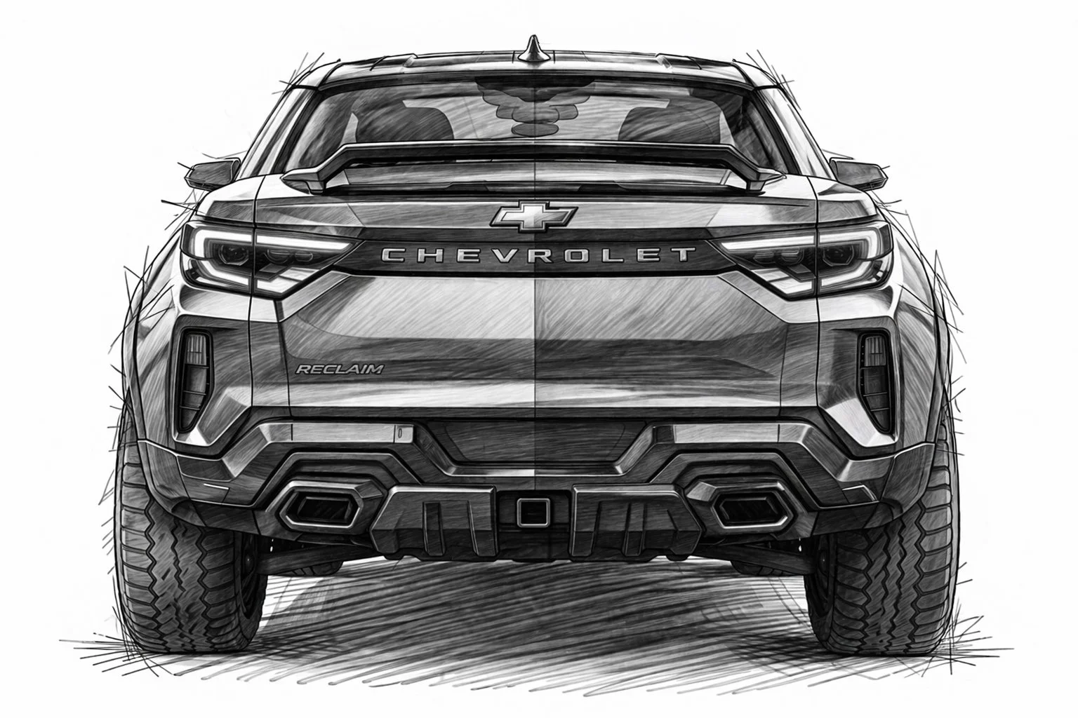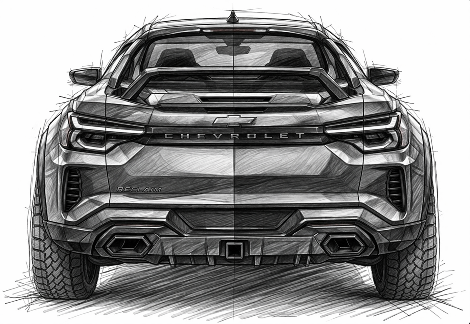 Create a highly detailed pencil sketch on a clean white background of the exact same Chevrolet performance adventure coupe concept shown in the previous 3/4 view, now in a perfectly aligned front view.