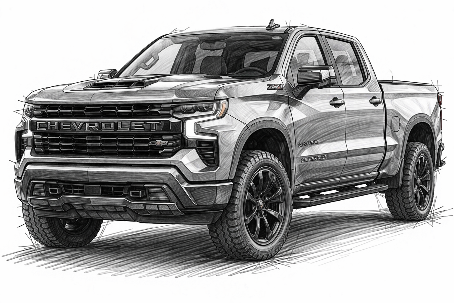 You are an automotive designer. Your task is to design a RUGGED OFF-ROAD VEHICLE like the Corvette Stingray that would appeal to the customer who is now purchasing the Chevy Silverado. You have to combine the rugged with the sleek. Your buyer is retired, over 50. I see them as rugged adventurists, and performance curious of off-road vehicles. I want the vehicle to be a true hybrid and I want the target market to feel their youth regained. Create a sketch on a blank white background of this exact vehicle,