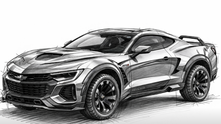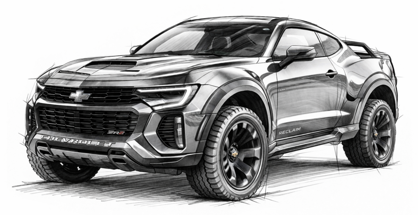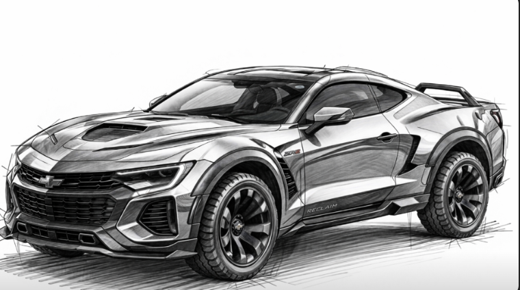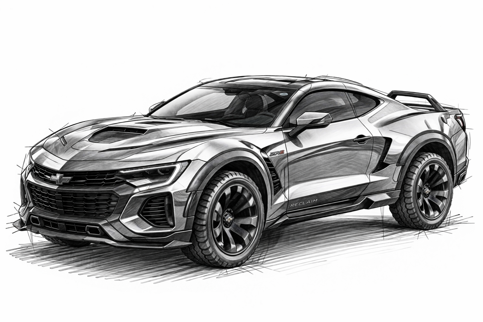 You are an automotive designer. Your task is to design a sleek sports vehicle like the Chevy Silverado that would appeal to the customer who is now purchasing the Corvette Stingray. You have to combine the sleek with the rugged. Your buyer is retired, over 50. I see them as performance curious, light adventure vehicles. I want the vehicle to be a true hybrid and I want the target market to feel their youth regained. Create a sketch on a blank white background of this exact vehicle