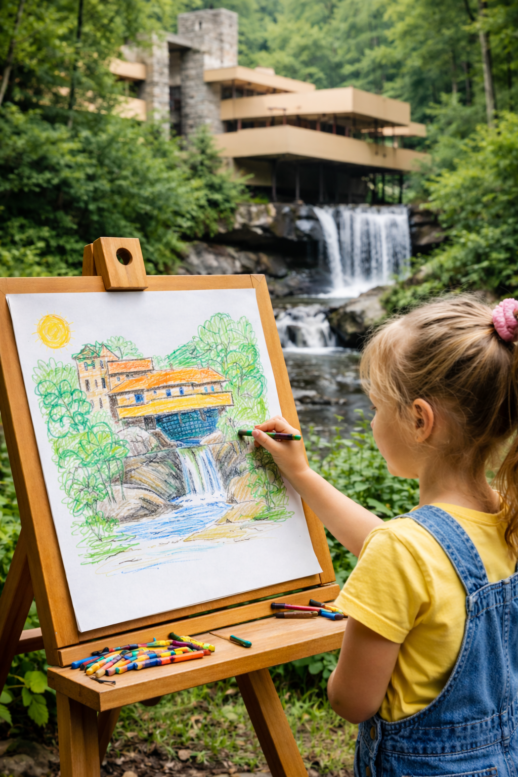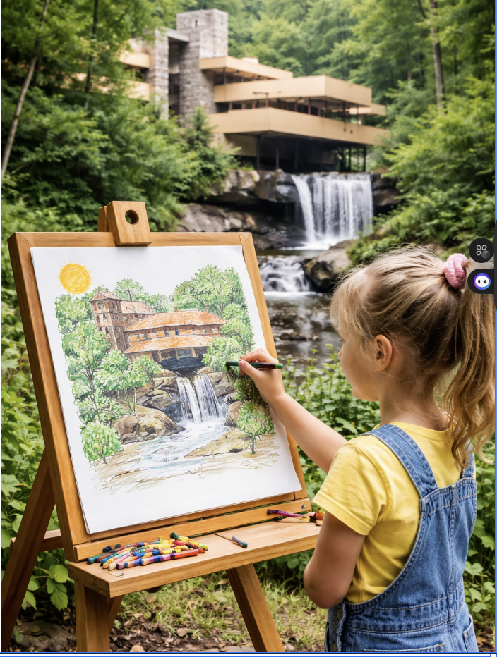 Create an image of a little girl drawing Frank Lloyd Write’s Falling Water house with the actual falling water in the background.
