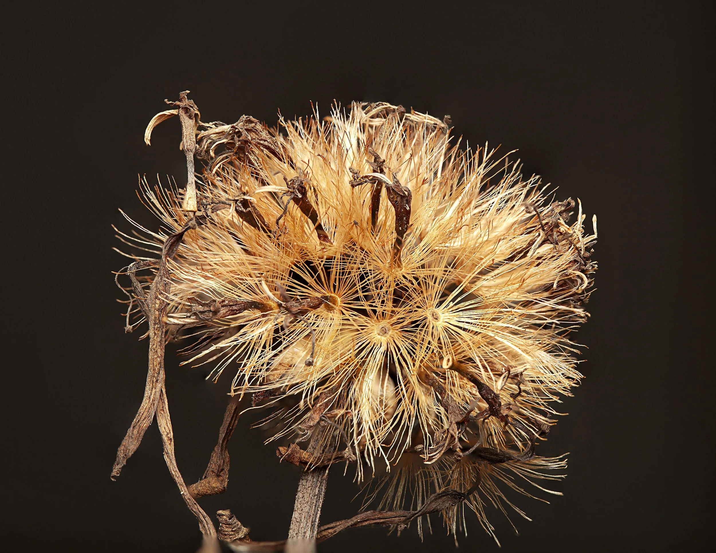 A delicate close-up of a dandelion seed head, capturing the airy structure of its radiating filaments and the fine, feathery textures of each seed. Focus stacking ensures sharpness across the spherical form, while gentle, diffused lighting enhances the translucence and intricate symmetry that make the dandelion a classic subject in macro photography.