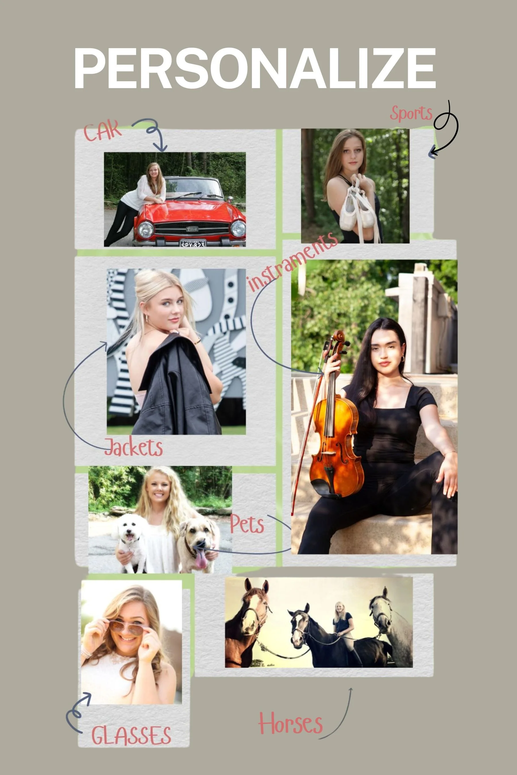 🎭 Bring Your Personality to Life! Include your pet, vehicle, sports gear, musical instrument, dance outfit, varsity jacket, artwork, best friends, or family.