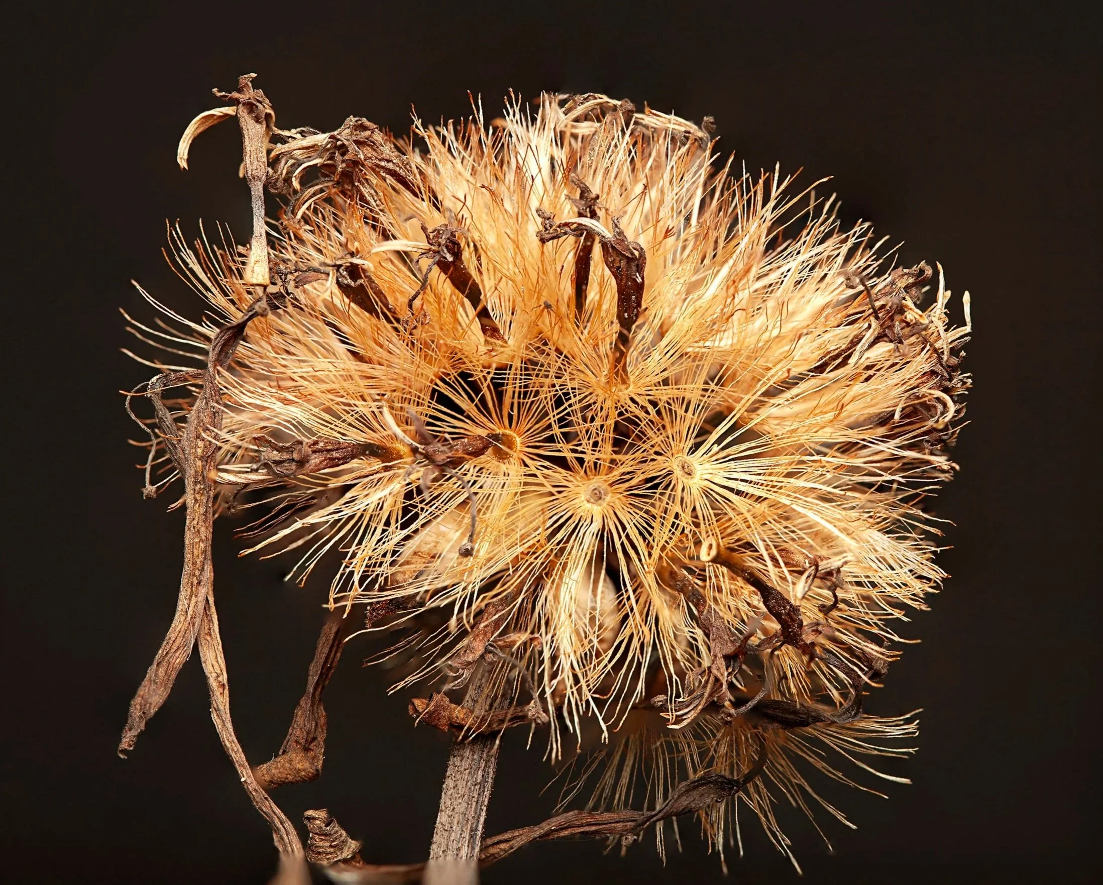 Description: A close-up capture of a dried flower. highlighting radial structures and the subtle interplay of light and shadow. Focus stacking and controlled lighting bring out texture, depth, and color.